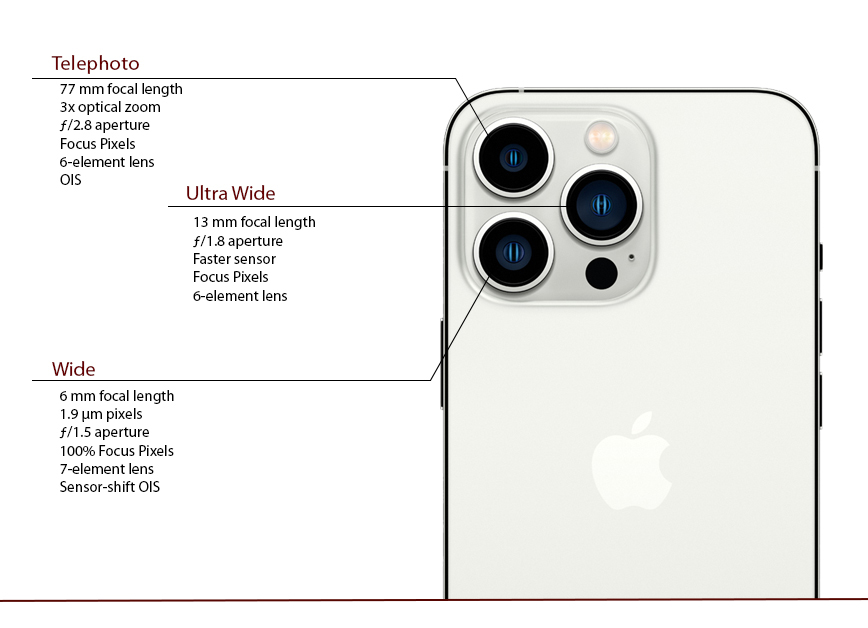 قابلیت های دوربین .. دارای سه دوربین 12 + 12 + 12 مگاپیکسل + یک دروبین TOF 3D LiDAR scanner (depth) در پشت - نورپردازی پرتره با شش جلوه - Panorama - Night mode Deep Fusion - Smart HDR 4 - Photographic Styles - Macro photography - Advanced red‑eye correction Photo geotagging - Auto image stabilization - Burst mode